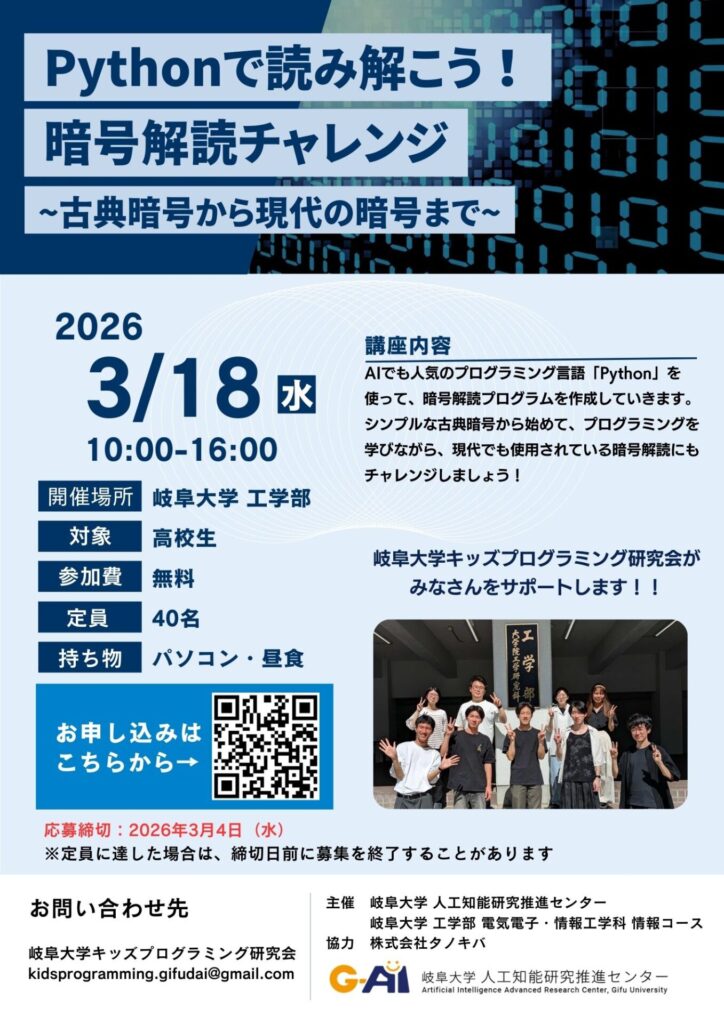 | 講座タイトル | 『Pythonで読み解こう!暗号解読チャレンジ』 ~古典暗号から現代の暗号まで~ |
