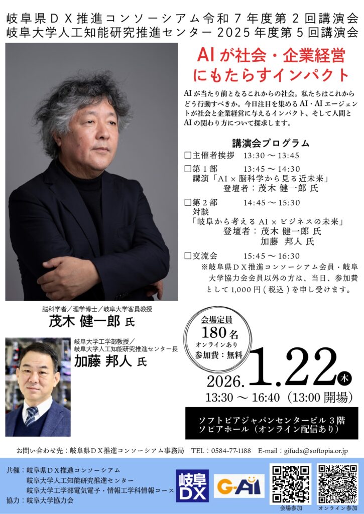 | スケジュール | 主催者挨拶 ー13:30~13:45 第1部【講演】ー13:45~14:30「AI×脳科学から見る近未来」 登壇者 茂木健一郎教授 第2部【対談】ー14:45~15:30「岐阜から考えるAI×ビジネスの未来」 登壇者 茂木健一郎教授・加藤邦人教授 交流会 ー15:45~16:30 ※岐阜県DX推進コンソーシアム会員、岐阜大学協力会会員以外の方は、当日、参加費として1,000円(税込)を申し受けます。 |